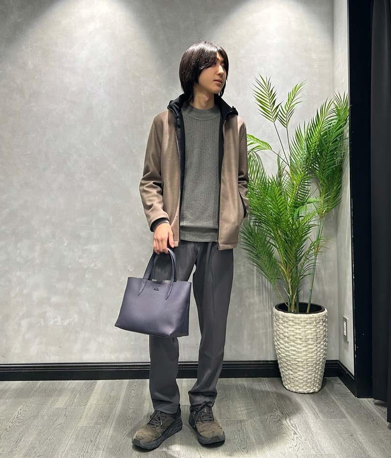 - スラックスやレザーシューズと素材感を揃えると統一感UP